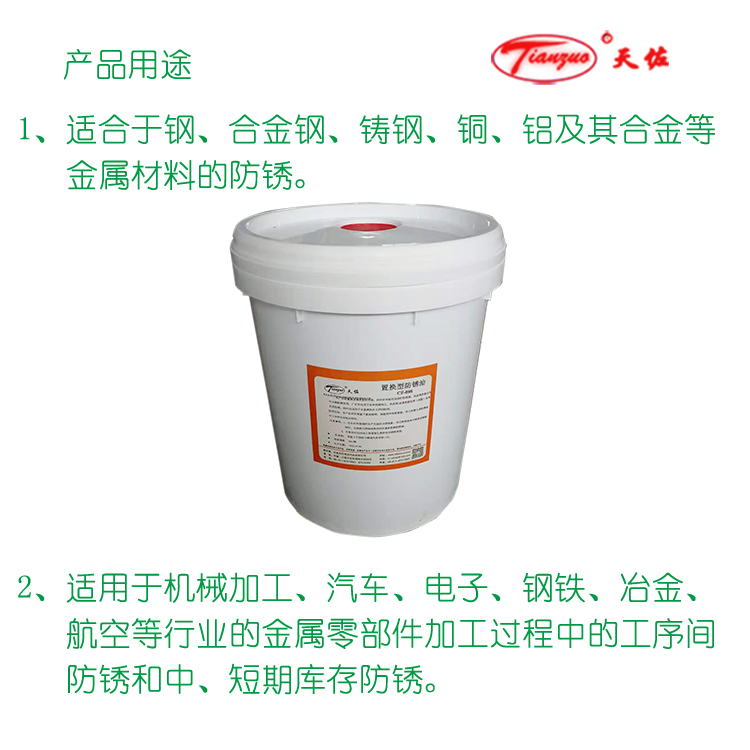 本品適用於鋼、銅、鋁等多種金屬機械加(jiā)工、精密零件加工工序間及製品存(cún)儲防鏽。具(jù)有用量少、無異味、無毒、無腐蝕性,安全方便的特點。根據零部件的材質或季節的不同可防鏽一至二年(nián)。
